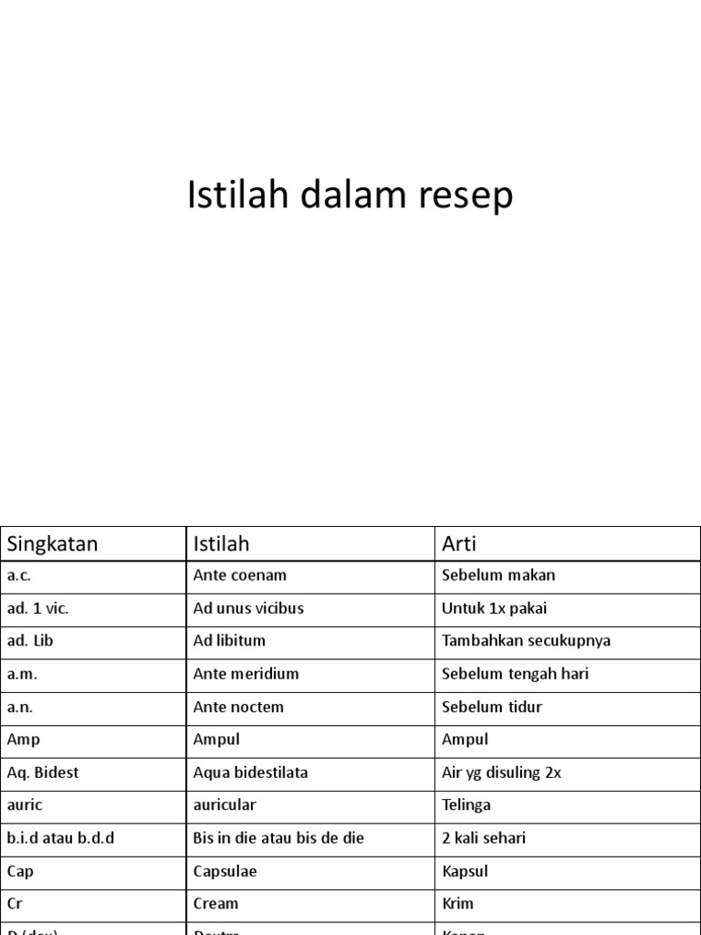 4 ante christum merupakan singkatan akronim resmi dalam bahasa indonesia. F signa da cum formula tandailah serahkan dengan formulanya p. Resep adalah permintaan tertulis dari seorang dokter kepada apoteker untuk memberikan obat jadi atau meracik obat dalam bentuk sediaan tertentu sesuai dengan keahliannya takaran dan jumlah obat sesuai dengan yang diminta dan menyerahkannya kepada pasien. 4 ante christum istilah 1 air conditioning.