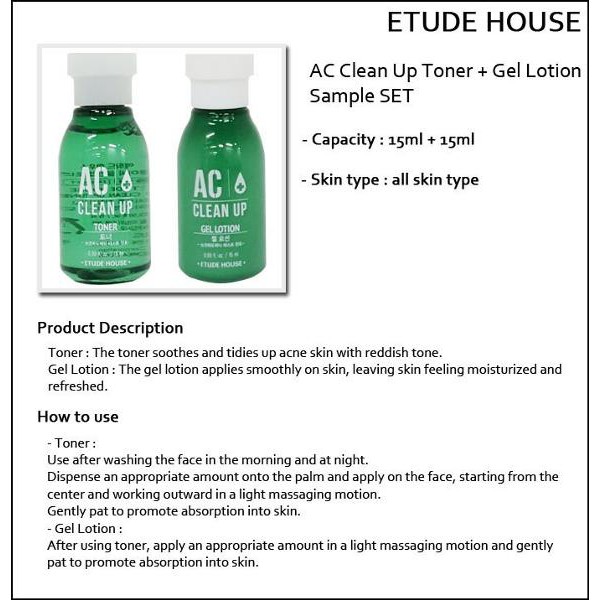 Etude clean up gel lotion merupakan moisturizer dari etude house yang berfungsi melembabkan wajah khususnya kulit berjerawat. Gel type moisturizer with reduced oily feeling. Ac clean up gel lotion gel lotion ini sebagai pelembab jangan berpikir kalau wajah yang berjerawat ga butuh pelembab ya. Volume 200ml how to use.