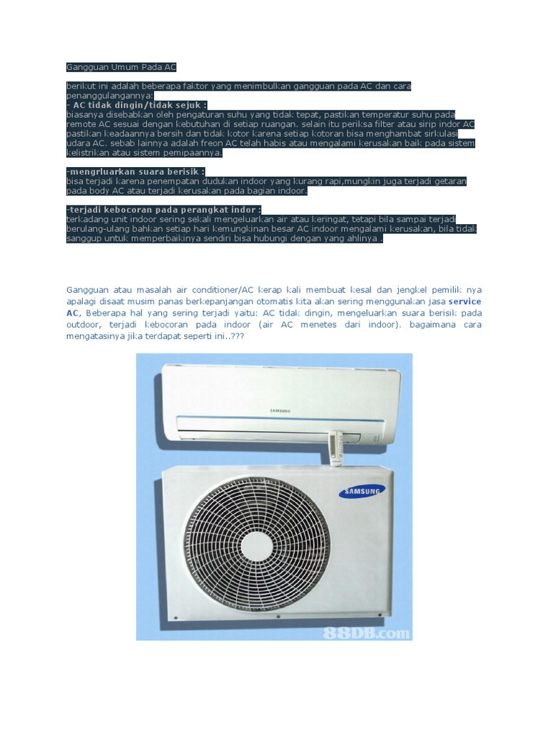 Ketahui penyebab ac bocor dan cara mengatasinya panduan ac chapter 32 ketahui penyebab ac bocor dan cara mengatasinya. Penyebab utama dan cara mengatasi air menetes pada indoor ac split permasalahan ac yang paling sering kita temui pada perumahan kantor ataupun hotel adalah masalah air yang menetes pada unit indoor ac split. Jika memang penyebab dipastikan penyebab bocor dari bagian pipa ini disarankan untuk melakukan pemggantian oleh teknisi servis ac langganan anda. Namanya juga selalu dalam keadaan dingin lama kelamaan pasti akan menyebabkan adanya lendir lumut yang bisa menyumbat instalasi selang pembuangan.